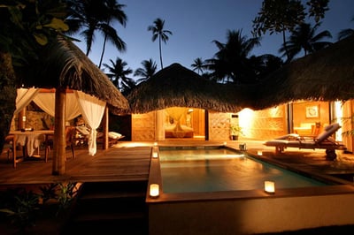 The resort has 58 suites and villas, which are mostly overwater bungalows. The thatched-roof structures are categorized according to view – sunset, Taha’a, or Bora Bora – with traditional Polynesian décor. Overwater bungalows have private terraces leading into the ocean, while beach villas have plunge pools, private gardens, and direct beach access.