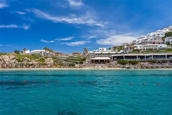 Resembling a Myconian village sprawled west of Ornos Beach, Santa Marina Resort promises peace and seclusion away from Mykonos’ crowds. Just 20 minutes from Mykonos Town, it offers dining options, an exquisite spa, and its own private beach.