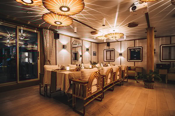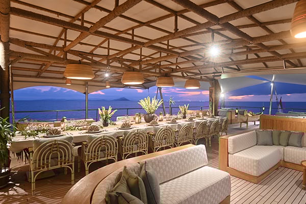 Meals on board are prepared by a private chef, offering a mix of Indonesian and international cuisine using fresh, locally sourced ingredients. Guests can enjoy dining on the deck with panoramic ocean views or in the indoor dining area.