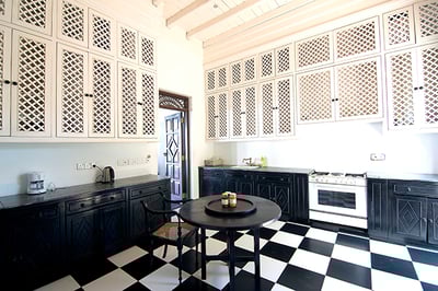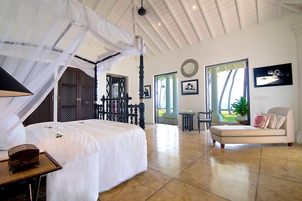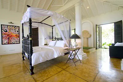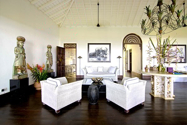 The beautifully appointed Dutch colonial villa features three bedrooms, an expansive living room with soaring 18-foot ceilings, sumptuous furnishings, and four-poster beds. The master suites come with outdoor showers. The villa is fully staffed and includes a chef.