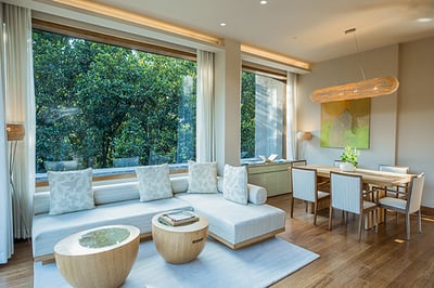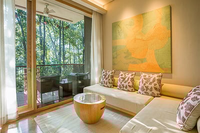 Living spaces, dotted throughout the gardens and surrounding jungle, are bright and contemporary, decorated using natural local materials. This neutral palette evokes a sense of calm without conflicting with the natural surroundings.