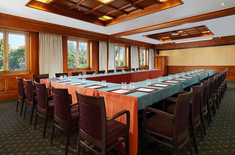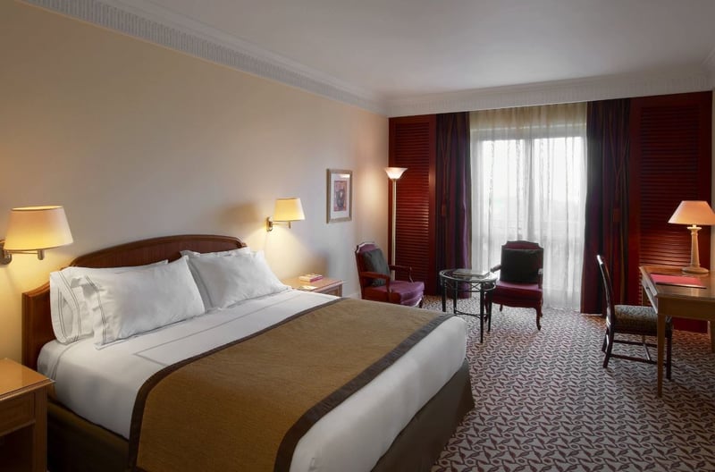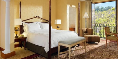 The hotel offers 295 guestrooms and suites decorated in classic style, with mahogany furniture, heavy drapes, marble en suites, and balconies overlooking the gardens, pool or hills. For the ultimate indulgence, book one of three private villas, each with pool, gym, Jacuzzi and sauna.