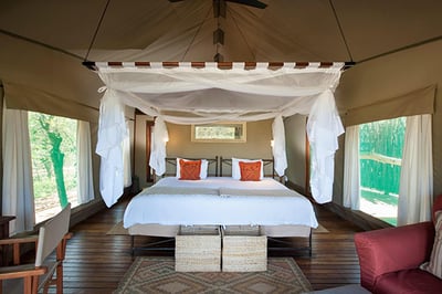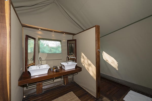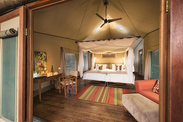 Up to 16 guests can be accommodated in eight spacious tents, each with simple but elegant décor, antique trunks and handcrafted furniture, an ensuite bathroom with an open-air shower and a private verandah. Seven tents are twin-bedded, and there is one two-bed family tent