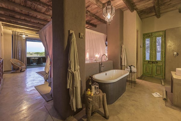 Onguma The Fort houses 11 mini suites plus a honeymoon suite and Sultan Suite. The spacious rooms have large beds draped in mosquito nets, indoor and outdoor showers, and verandas where you can watch the sunset while listening to the roar of lions. The Sultan Suite has a lounge, private viewing deck and large bath in addition to the two showers.