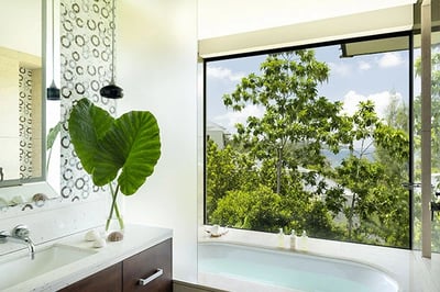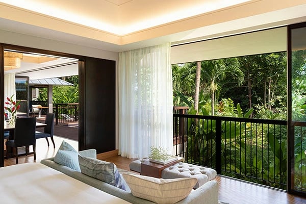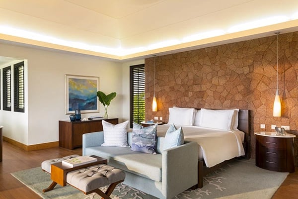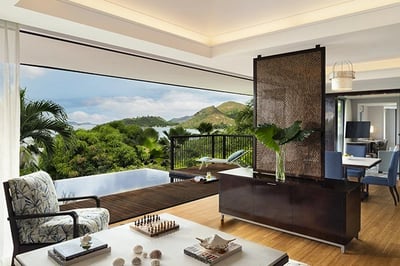 The 86 stylish and sophisticated hillside villas are some of the largest in the region. Each one includes a four-poster bed, a deck leading to a pool, a bathtub with a view, and the luxury of around-the-clock butler service. Golf carts are available to take you around the resort.