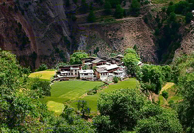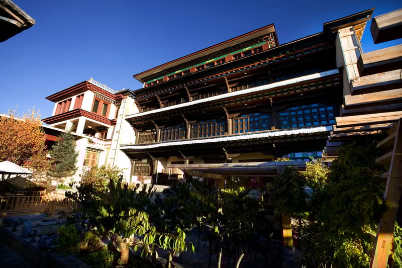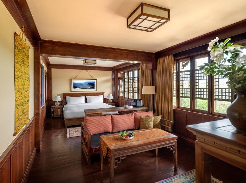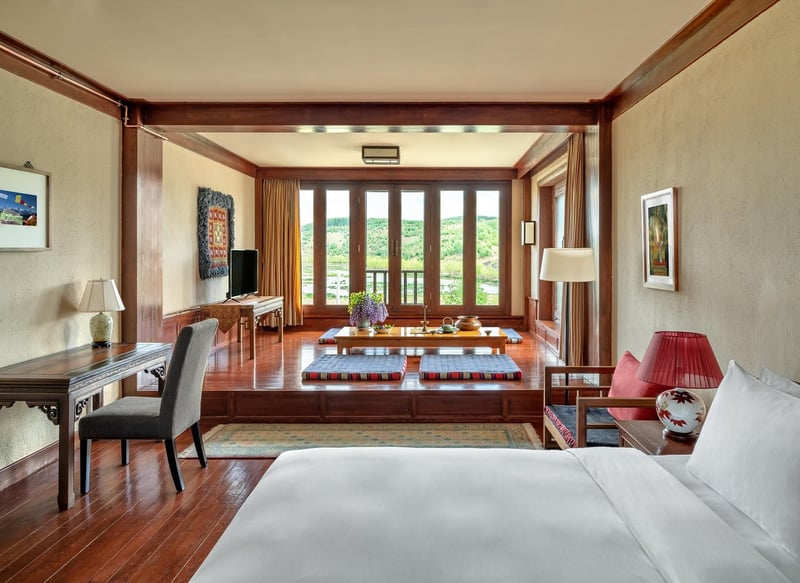 Nestled in an intimate green valley by Yunnan's Yangtze River, Songtsam Benzilan features ten spacious guest rooms, all decorated in modern Sino-Tibetan style. The lodge is surrounded by authentic white-walled Tibetan homes and has views of a smaller prayer house resting atop a little hill (great for morning visits when one member from each family in the village hikes to the top to pay their respects). Facilities include a library, rooftop terrace, and restaurant serving fresh food from the garden. Activities include learning how to make traditional black pottery in the nearby Nixi village, guided visits to Dongzhulin Monastery, Benzilan valley hikes through Tibetan villages, and experiencing a night of traditional Tibetan dancing.