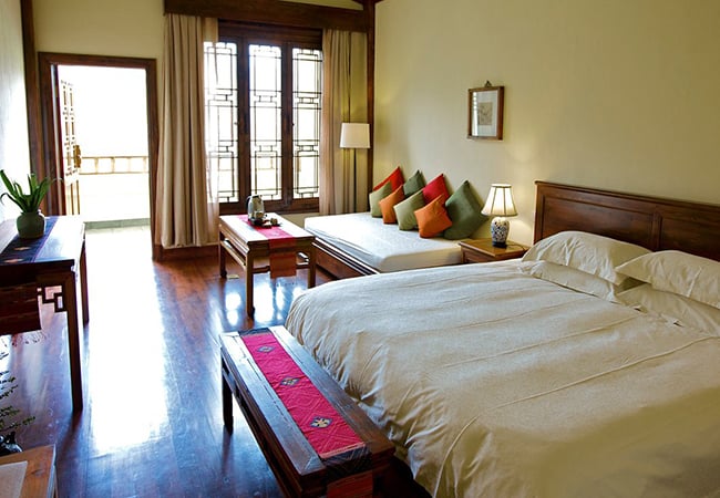 Part of a mixed Tibetan/Lisu farming community, Songtsam Tacheng enjoys a comfortable climate that boasts Yunnan's most fertile land. All nine spacious yet cozy rooms face beautiful terraced rice fields. Tacheng is also home to the endangered Yunnan Golden Monkeys, which make it an endearing wildlife environment, popular for family excursions and romantic getaways. Facilities include an outdoor pool and restaurant serving locally-grown organic vegetables as well as wild honey, fish, and ham. Activities include guided hikes through beautiful villages and rural areas, seeing the Golden Monkeys at the Baima Nature Reserve, walks through local Naxi villages, and local dances arranged by the lodge.