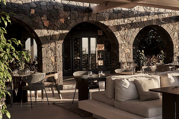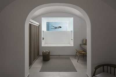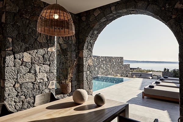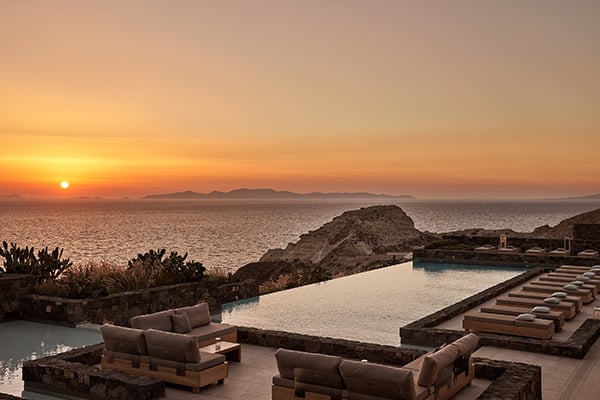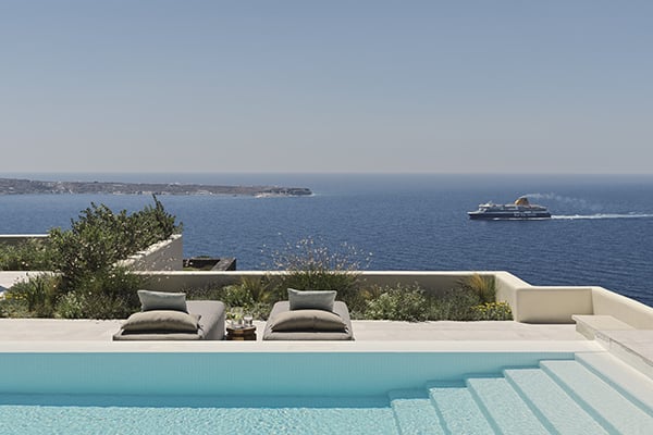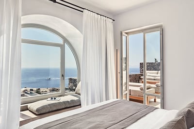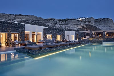 Canaves Oia Epitome feels like a world of its own. The design combines natural and earthy materials with modern design in excellent Greek fashion. Each of the 24 luxury villas all features private outdoor pools and uninterrupted sea and sunset vistas - the only place on the island to offer sea views from each room. Our favorite spot is the outdoor fine dining restaurant and lounge, which is quite likely to offer the best sunset views in Oia.