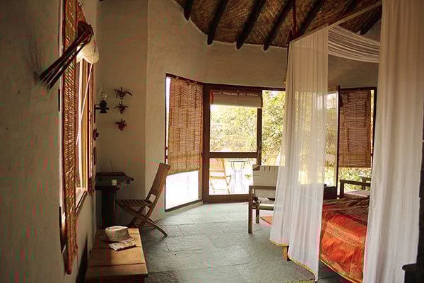 The lodge has four cottages, each with their own courtyards and verandas. Built from mud and thatch, they feature elegant interiors, daybeds overlooking the wilderness, and en suites with indoor-outdoor showers. The cottages are connected to the main lodge via a network of paths and bridges.