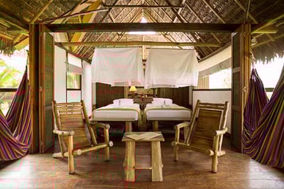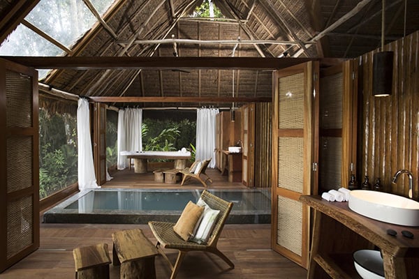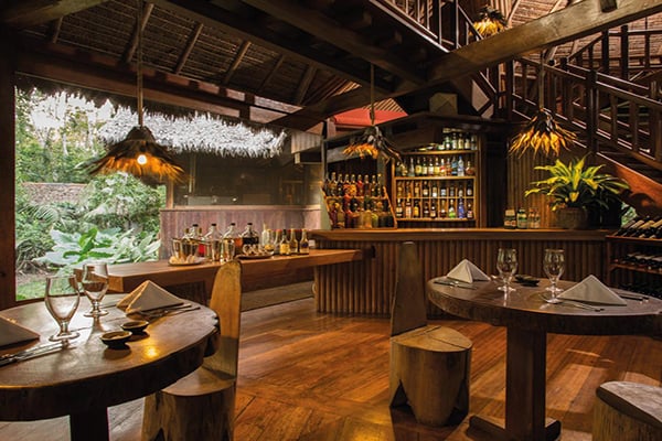 It offers 35 elegant, thatched-roof cabanas that combine rustic local style with contemporary influences. Superior rooms are wooden cabanas topped by a high thatched-palm roof, equipped with a canopy mosquito net and hammock of the screened siesta area. Superior Rio enjoy an expansive view of the Madre de Dios River and features an open plan bathroom. The Amazonica suites include a spacious bedroom with one king or two twin beds and luxurious toilet size. Tambopata suites boast a private sheltered terrace with plunge pool, sunbathing chairs and outdoor shower in four integrated areas. All rooms are equipped with rainforest gear such as umbrellas, flashlights, kerosene lamps and ceiling fan.